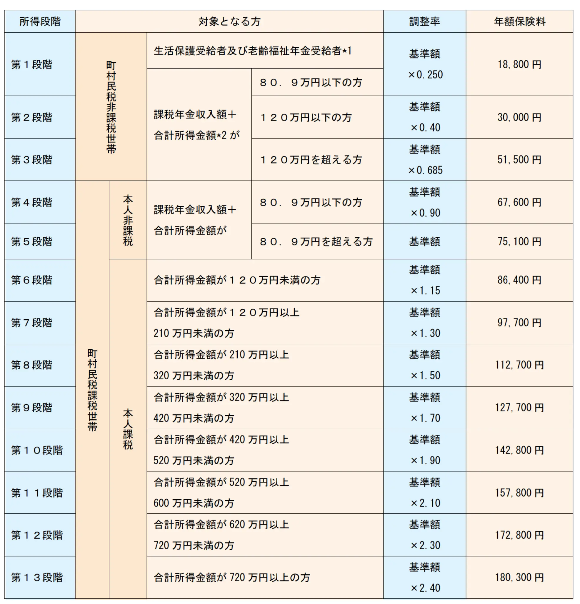 保険料は所得に応じた負担になるよう13段階に分かれ、それぞれの金額は以下のように計算されます。